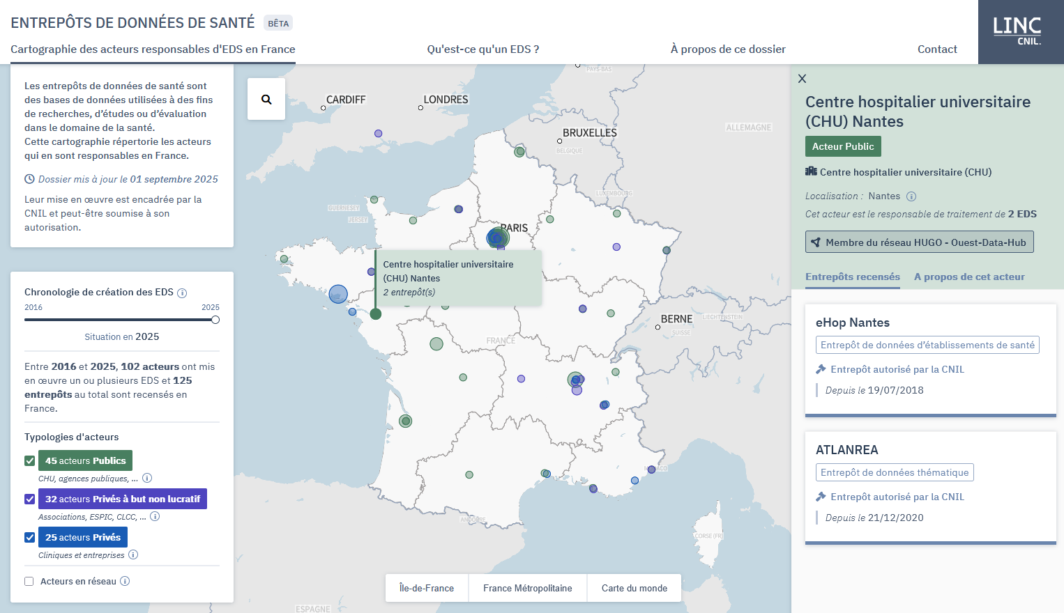 La cartographie des entrepôts de données de santé (EDS) rend plus compréhensible l’écosystème de la recherche sur les données de santé en France, à travers le recensement et la position géographique des acteurs mettant en place ces EDS. Publiée en octobre 2024, elle a fait l’objet d’une mise à jour (jusqu'au 1er septembre 2025). Le LINC en présente les changements majeurs dans cet article.